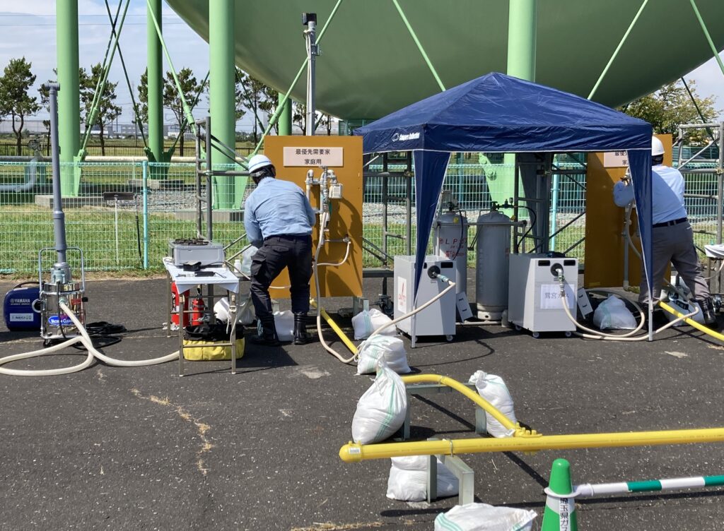 続けて、損傷によりガス漏れしているガス管の遮断訓練、移動式ガス発生設備を用いた臨時供給訓練、損傷管の中に入り込んだ水や石などの排出訓練が行われました。