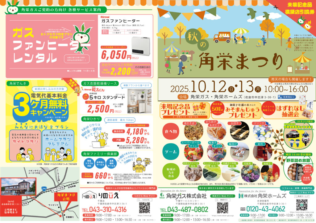 日頃より、角栄ガスをご愛顧いただき 誠にありがとうございます。この度、千葉サービスセンターにて「秋の角栄まつり」を開催いたします。模擬店やゲーム、地域の方々から多数の出店をご用意しております。また、例年ご好評いただいております「野菜詰め放題」も開催いたします。チラシと引き換えに記念品もご用意しておりますので、皆さまのご来場、心よりお待ちしております。