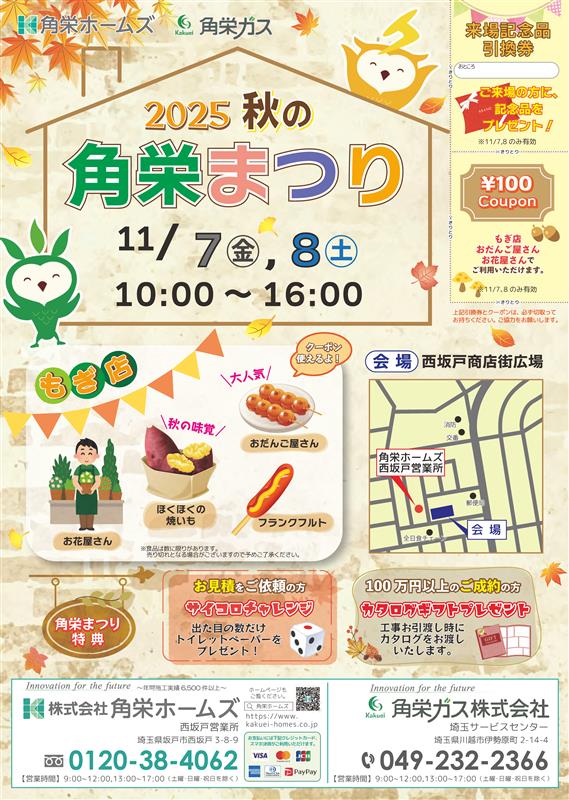 日頃より、角栄ガスをご愛顧いただき誠にありがとうございます。この度、お客様への日ごろの感謝を込めまして、西坂戸サービスステーションにて「秋の角栄まつり」を開催することとなりました。もぎ店や地域のお花屋さんの出店を予定しております。また、ご来場いただいた方に記念品もご用意しております。皆さまのご来場、心よりお待ちしております。